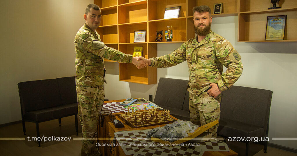 Бійці полку «Азов» отримали можливість ще більше розвивати свої інтелектуальні здібності. Офіцер підрозділу Юрій Михальчишин (друг Нахтігаль) передав азовцям подарунки від свого батька, міжнародного гросмейстера, видатного шахового діяча, тренера, Віце-президента Європейського шахового союзу Адріана Михальчишина. Високий рівень гри наших бійців показали нещодавно проведені шахові змагання, де азовці демонстрували свої здібності під час напружених двобоїв.
