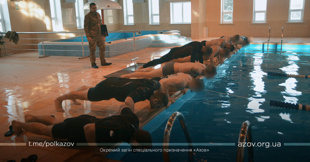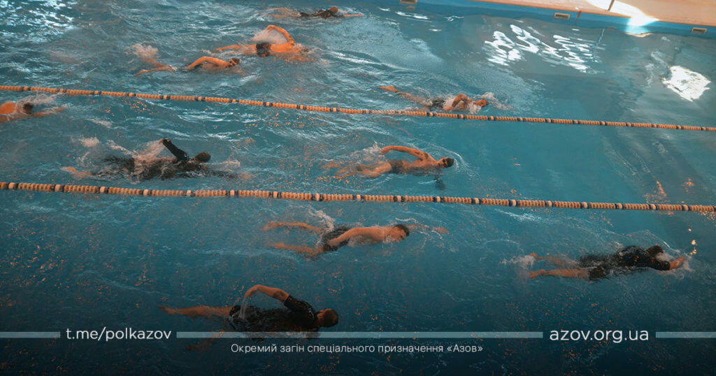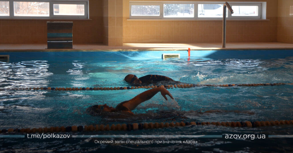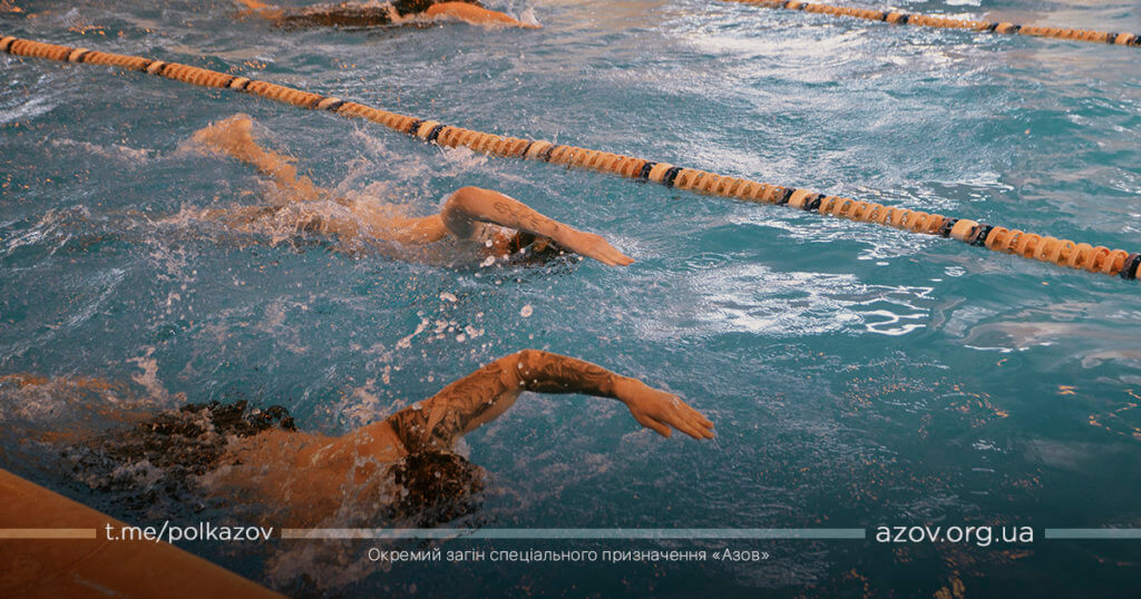 Чергове завдання, яке стояло перед азовцями, – пропірнути 25 метрів. Після цього бійці виконували комплекс силових вправ, який став справжнім випробуванням на витривалість. Він включає 20 відтискань, заплив на 25 метрів кролем, на протилежному кінці басейна 10 виходів силою – і таких 10 кругів у досить швидкому темпі, без відпочинку між кругами. До фінішу дійшли не всі, адже давалася взнаки втома після попередніх вправ.