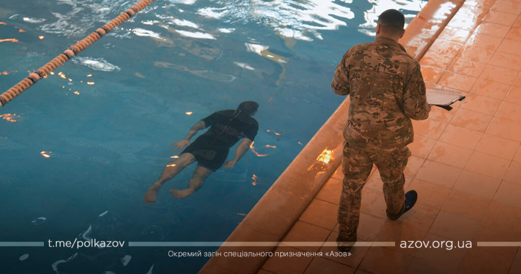 Найперше, що мали зробити азовці, – пропливти 500 метрів вільним стилем, при цьому вкластися у 12 хвилин. Усі впоралися із цим завданням, а один із бійців проплив 500 м за 7 хв 33 с – дуже хороший показник. Після запливу і короткого відпочинку – затримка дихання мінімум на хвилину. Це також не стало проблемою для азовців, а найкращий результат склав 2,32 хв. Далі – вправа не стільки на фізичну витривалість, скільки на психологічну. Це заплив на 25 метрів зі зв’язаними руками і ногами.