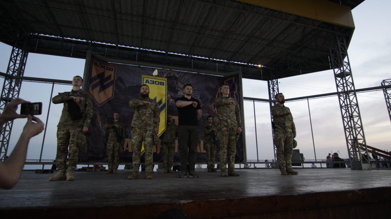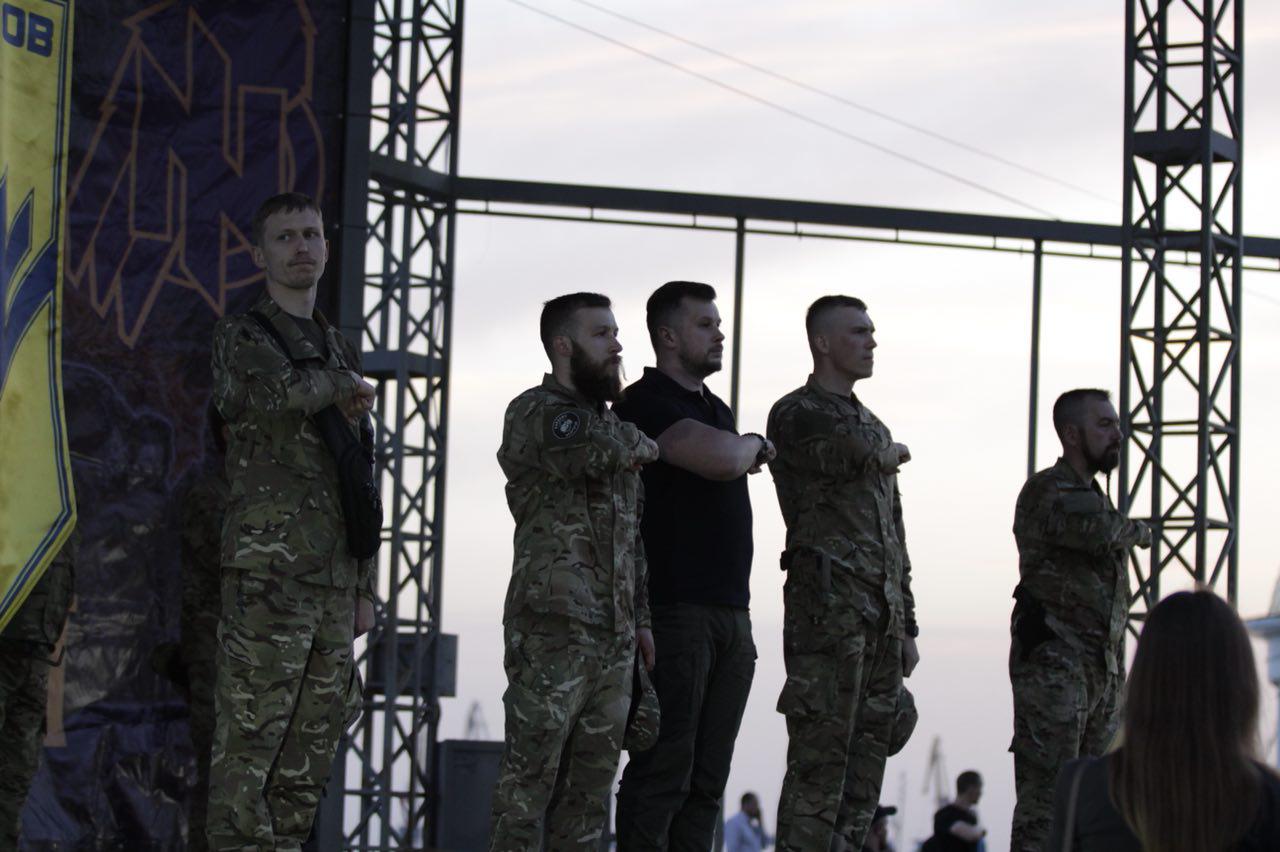 Тут привітальні слова з нагоди свята виголосили командир полку АЗОВ друг Редіс та колишні командири підрозділу – Андрій Білецький, Ігор «Черкас» Михайленко та Максим «Мосе» Жорін. Промовам командирів передувала хвилина мовчання на честь всіх загиблих азовців.