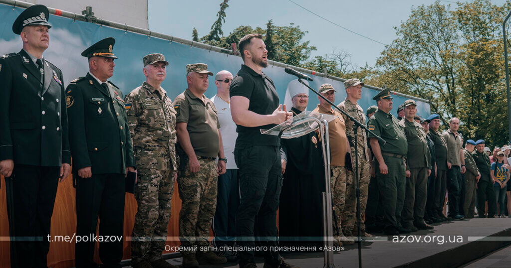 По закінченню урочистих промов бійці полку «Азов» отримали з рук командувача Національної гвардії України відомчі нагороди НГУ, МВС та нагородну зброю.