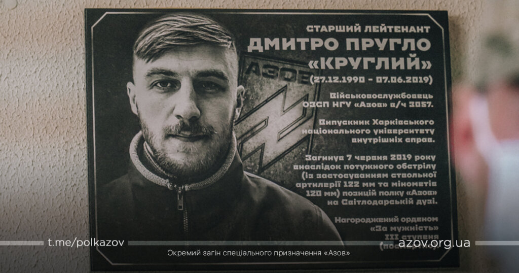 25 червня у Харківському національному університеті внутрішніх справ відкрили пам’ятну дошку бійцю полку «Азов» Дмитру Пруглу на псевдо «Круглий». Азовець поліг смертю хоробрих 7 червня 2019 року під час виконання бойового завдання на Світлодарській дузі внаслідок важкого прицільного обстрілу ворожої артилерії.